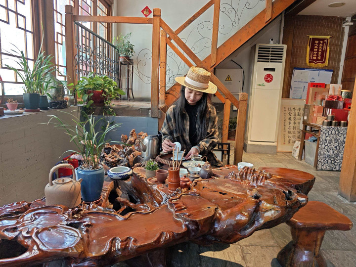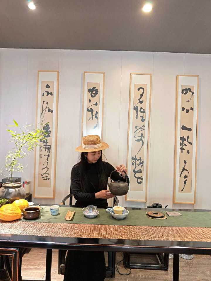 整个空间设计中,最具特色的便是对纳西族文化元素的巧妙融入。从木质格栅上的东巴文图案,到茶艺师身着的纳西族传统服饰;从茶桌上的东巴文茶席,到展厅内的纳西族茶俗展品,每一处细节都彰显着纳西族文化的独特魅力。木澜玥作为纳西族木府后人,始终致力于将纳西族文化与茶文化相结合,她认为,云南茶文化的精髓,离不开各民族文化的滋养,只有将民族文化融入其中,才能让茶文化更具生命力与独特性。这种设计理念,不仅让茶境清溪台区别于其他茶文化空间,更让它成为了传播纳西族文化与云南茶文化的重要载体。
